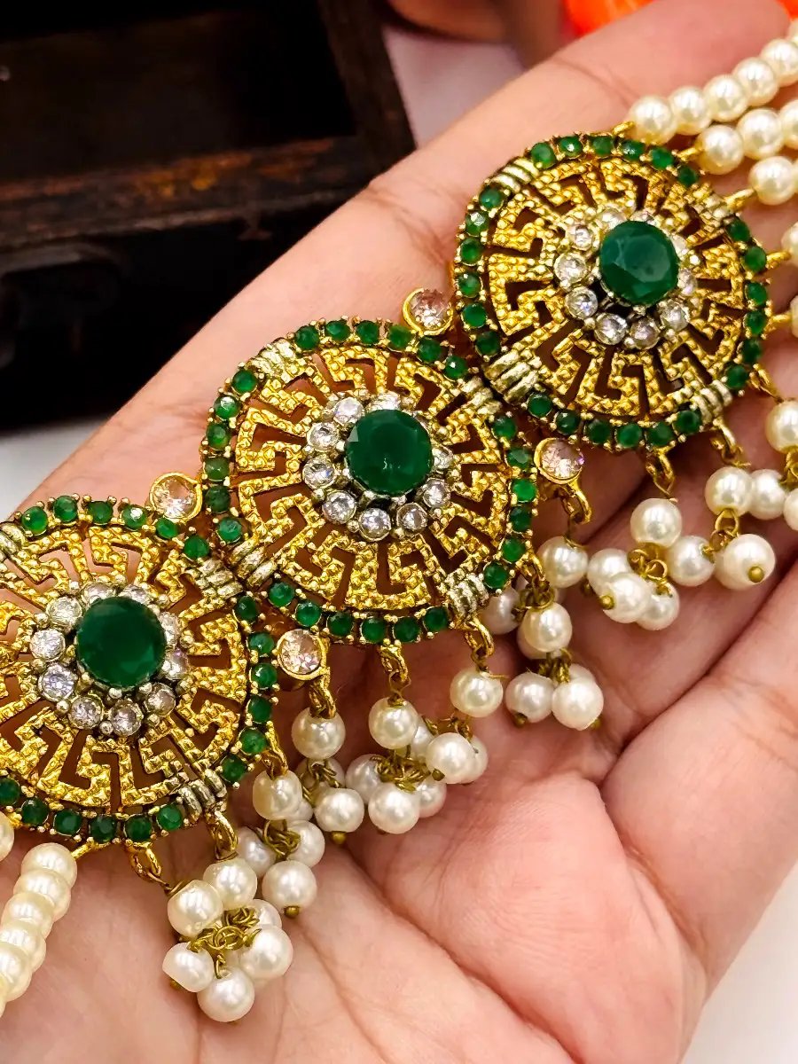 Add a touch of regal charm to your festive looks with Styleline’s AAROHI Choker Set, crafted with intricate detail and traditional Pakistani artistry. This luxurious set features a beautifully designed multi-strand pearl choker paired with stunning circular green-and-gold centerpiece motifs embellished with crystal stones for an elevated shine.