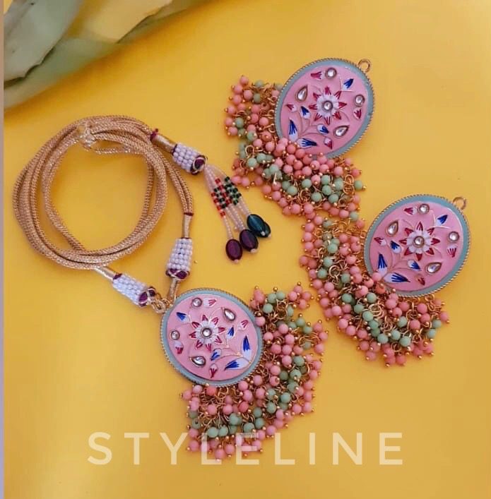 Captivating hand painted meenakari earrings and choker embellished with chunks of crystals in eye-catching color combination.