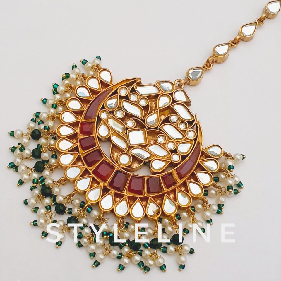 StyleLine’s finest quality Kundan Teeka with pearls and green beads – perfect for bridal, wedding, and festive wear.
