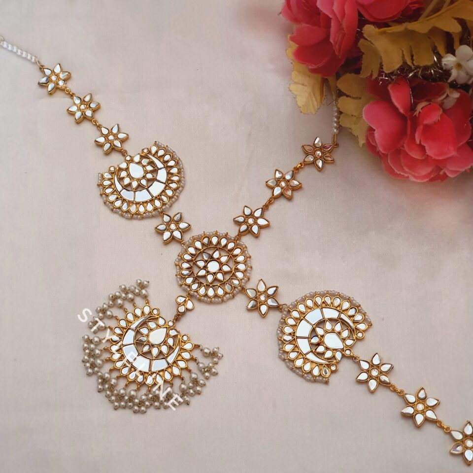 Anvi hand harness is a perfect hand piece for the timeless and elegant look. This traditional yet stylish hand harness is definitely going to steal the limelight. Engraved with mirrors and pearls on high quality brass is surely a perfect fit for a queen like you.