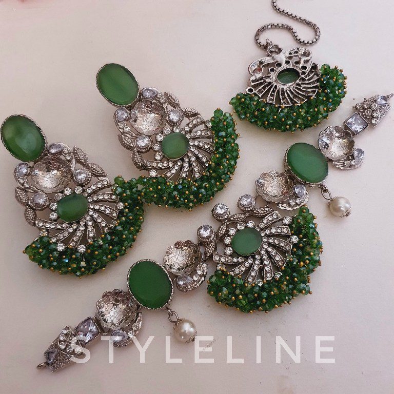 The standout feature is its detachable teeka, allowing for versatile styling options to suit your mood or occasion. The piece is embellished with colorful beads and elegant semi precious stones, beautifully blending tradition with contemporary appeal. Perfect for bridal or festive wear, this Sheeshpatti and Jhumki set is designed to make a lasting impression.