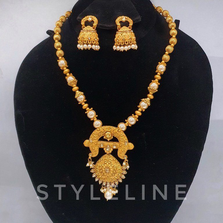 The set comprises of a beautiful Kundan mala, matching earrings, and bindi. Each piece is adorned with sparkling kundan stones and is finished with intricate dull gold plating. The mala features a stunning design with intricate beadwork and delicate hanging beads. The earrings and bindi are designed to match the mala, giving you a complete and coordinated look.