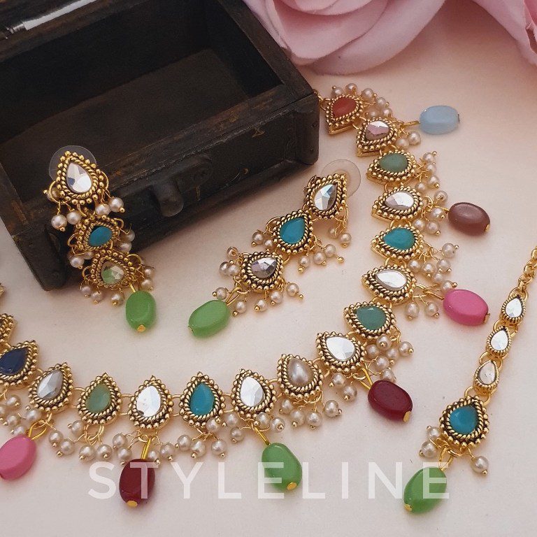 Adorn yourself with timeless elegance and iridescent beauty with our exquisite ZIMAL zircon locket set. Plated with 22k gold, handcrafted with precision and featuring perfectly studded sparkling semi-precious emerald and zircons. This set embodies sophistication and allure. Indulge in luxurious style and make a statement that is as stunning as you are.