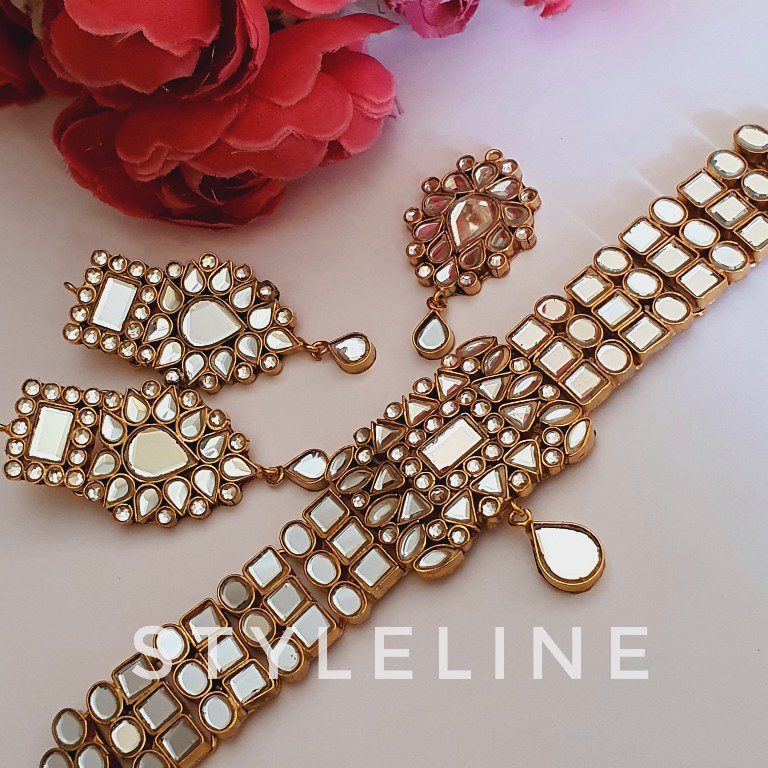 Finest quality gold plated farshi kundun choker, earrings bindi set.