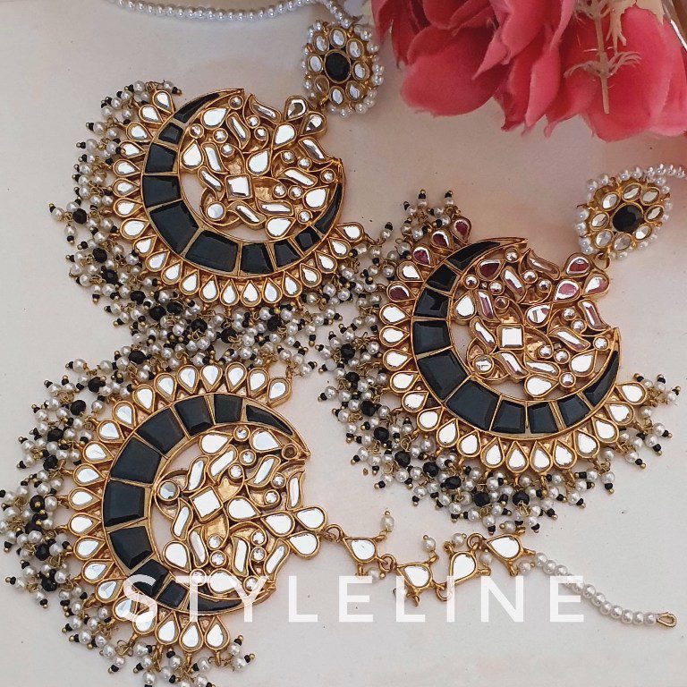 Finest quality 22k gold plated farshi kundun jhumka and bindi set in black color.