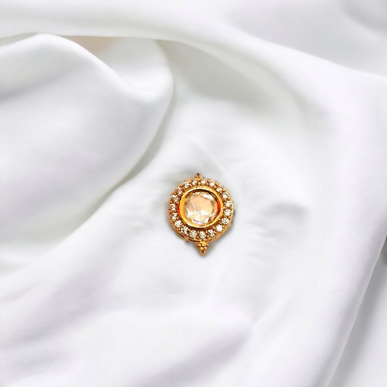 This spectacular nose ring features a classic crescent design richly embellished with shimmering, high-quality stones set in a luminous gold-tone base. The detailing is further enhanced with delicate accents of gold and small off-white pearls, creating a soft, rich texture that complements intricate bridal embroidery.