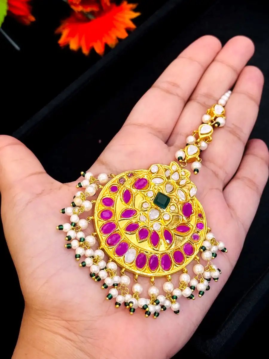 Add a royal charm to your festive and bridal look with this Premium Quality 22K Gold Plated Thappa Kundan Earrings and Bindi Set by StyleLine. Handcrafted with precision, this exquisite jewelry set showcases traditional artistry featuring vibrant emerald green and chetam pink stone detailing, gold plating, and elegant pearl hangings for a timeless finish.