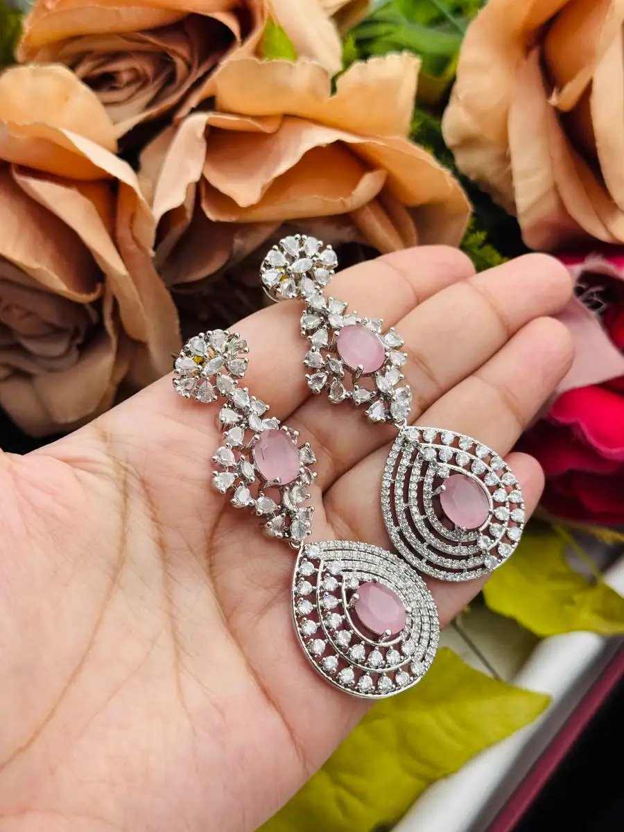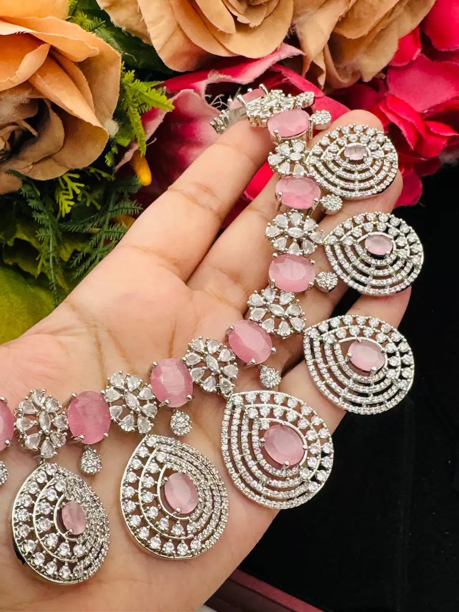 Premium-quality zircon necklace set featuring pink stones, matching earrings, and bindiya. A perfect blend of luxury and elegance for weddings, parties, and festive occasions.