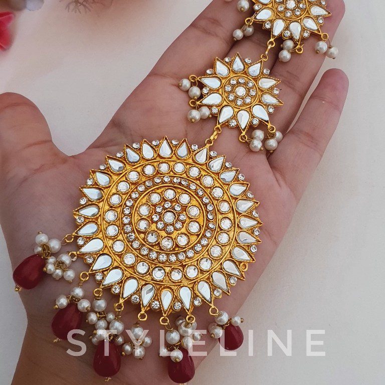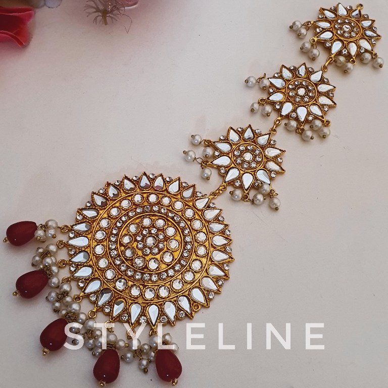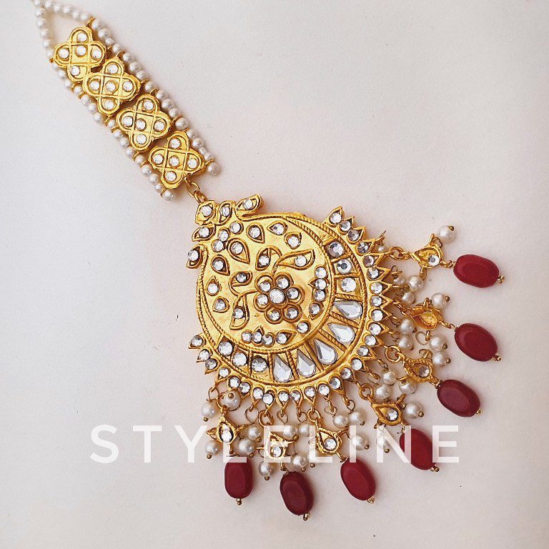 Handcrafted 22k gold-plated farshi kundunĀ oversize teeka/ bindi in maroon color.
