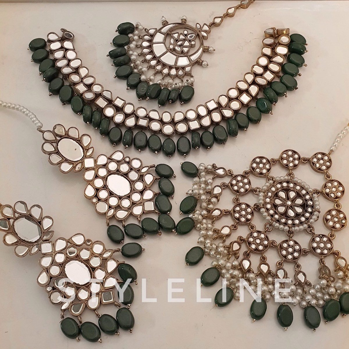 Finest quality handcrafted gold plated farshi kundun necklace set in green.