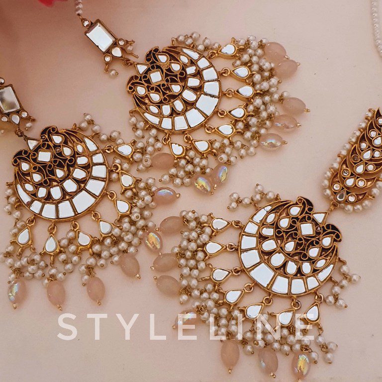 Dazzle with our Nija headpati and jhumki set and take your formal look to next level. This is classic set bejeweled with sparkling semi precious stones, pearls and crystals making it a perfect ensemble to get hands on,