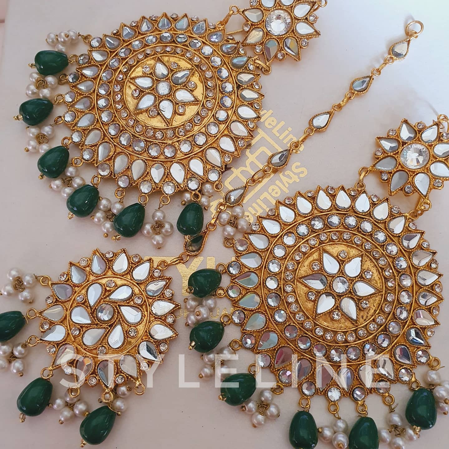 Handcrafted finest quality gold plated farshi kundun earrings and bindi set.