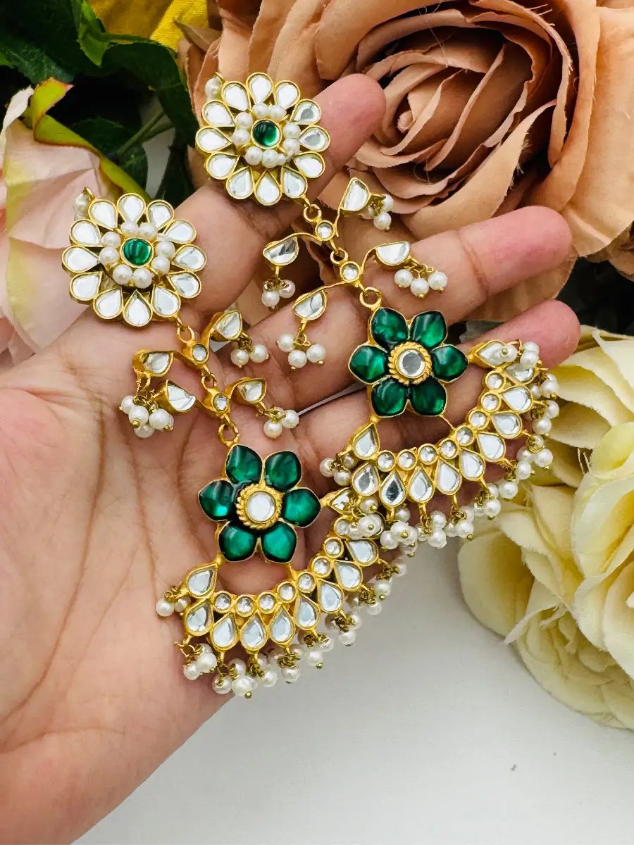 Add a regal touch to your ethnic ensemble with these stunning gold-plated pota Kundan earrings. Intricately handcrafted, these earrings feature a vibrant floral motif adorned with high-quality white and green Kundan stones, framed in an elegant gold-plated finish. The bottom is gracefully embellished with delicate pearl drops, creating a perfect blend of tradition and elegance.