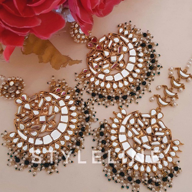 Finest quality 22k gold plated farshi kundun oversize earrings and bindi set.