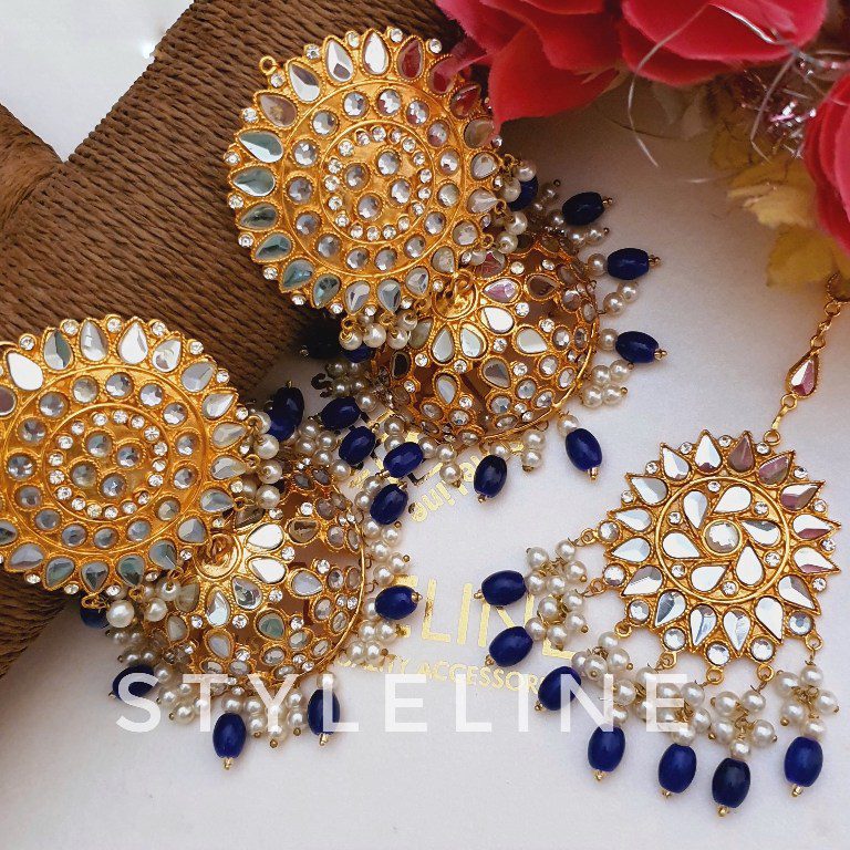 Hancrafted large size bahwalpuri jhumka and bindi set in blue.