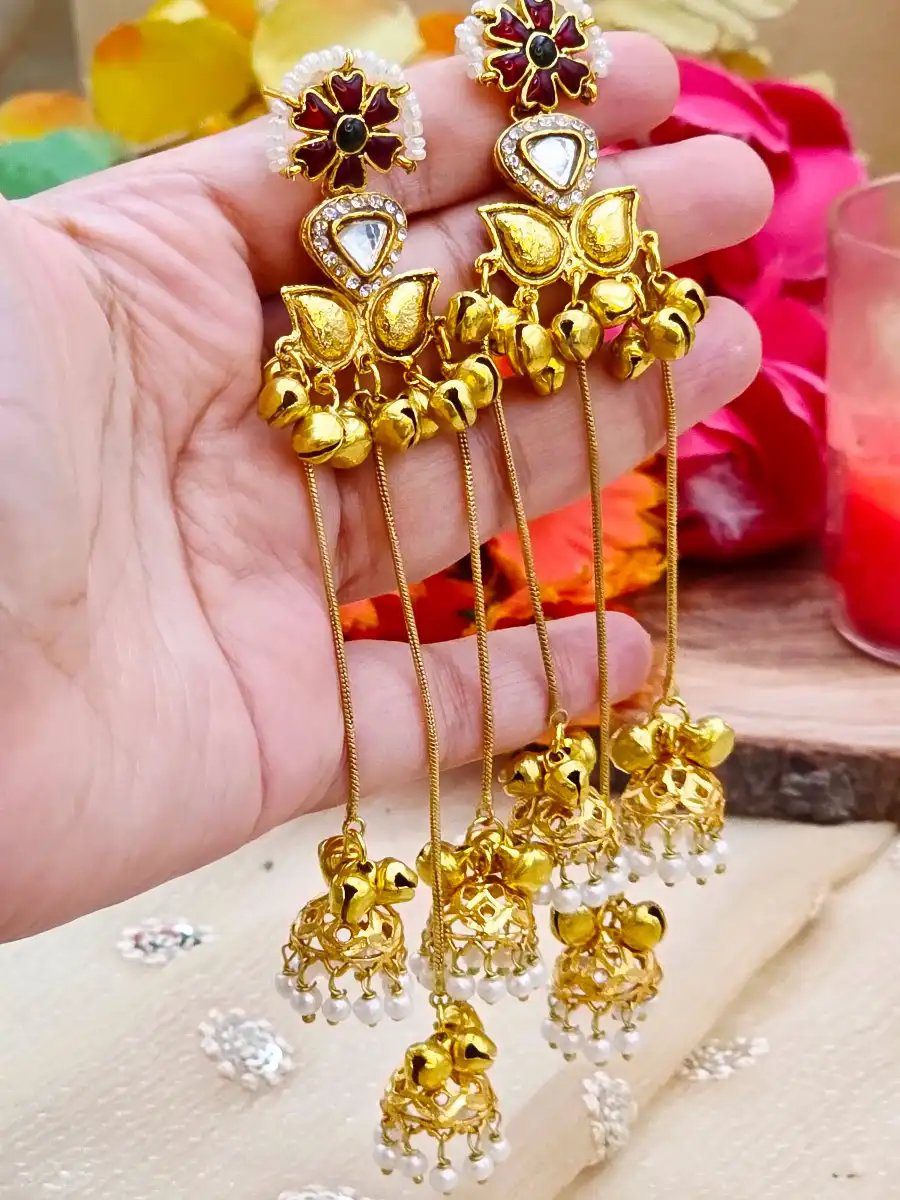 The elongated silhouette flows beautifully into dangling jhumki charms, creating graceful movement and a regal look. Finished in premium plating, these earrings are designed to complement traditional outfits.