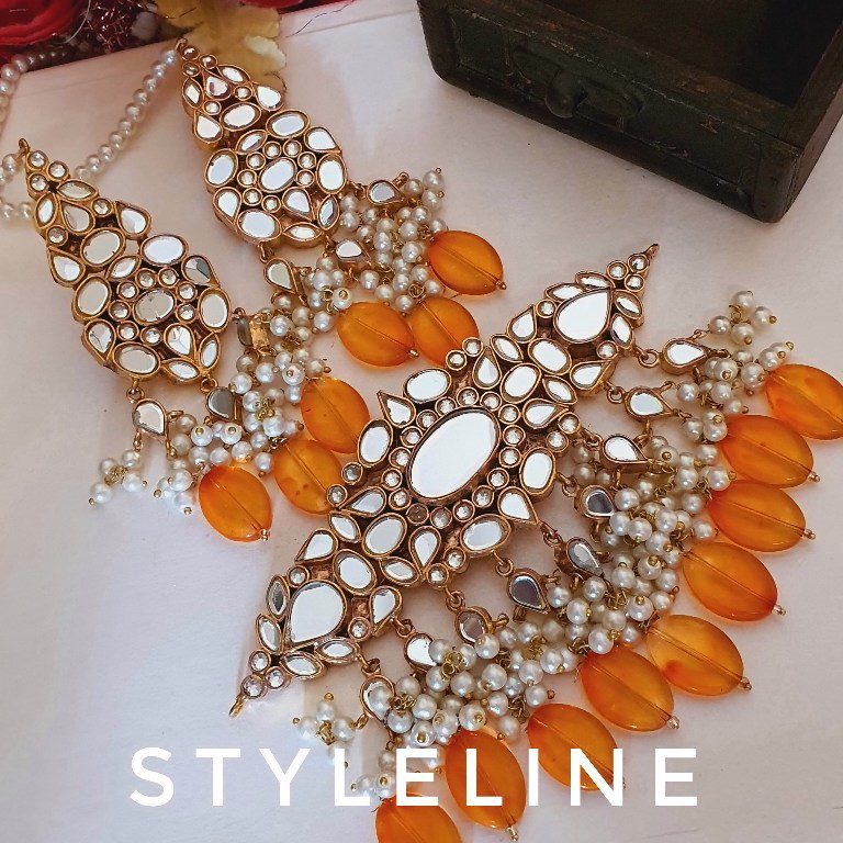 22k Gold Plated farshi kundun choker and earrings set in orange.
