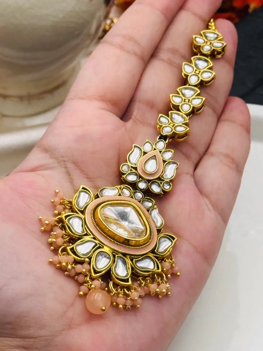 StyleLine’s premium Jaipuri Kundan Earrings and Bindi Set handcrafted with uncut Kundan stones, peach beads.. Perfect for brides and festive occasions.