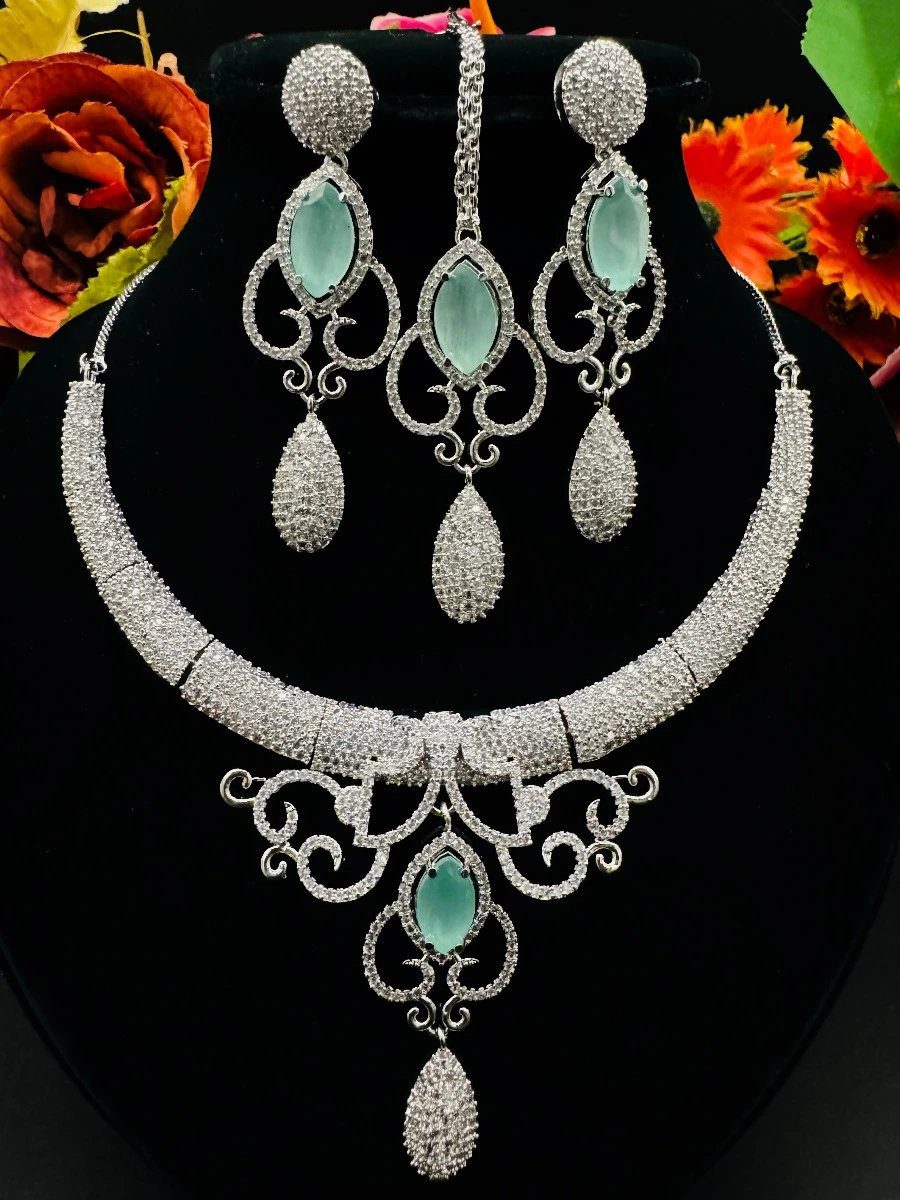 Gey ready to shine like never before with our sparkling zircon studded Damas necklace set. Handcrafted with highest quality zircon, this set is epitome of elegance! Indulge yourself in the sheer beauty of our meticulously crafted pieces, designed to dazzle on any occasion.