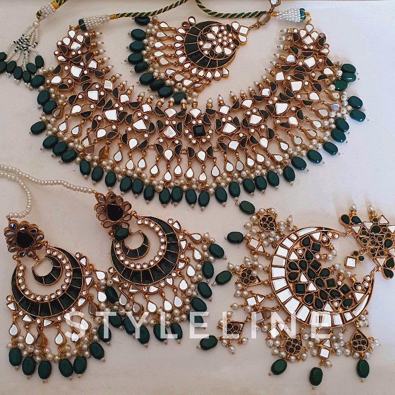 Finest quality handcrafted farshi kundun choker set studded with semi precious stones in maroon and green combination.
