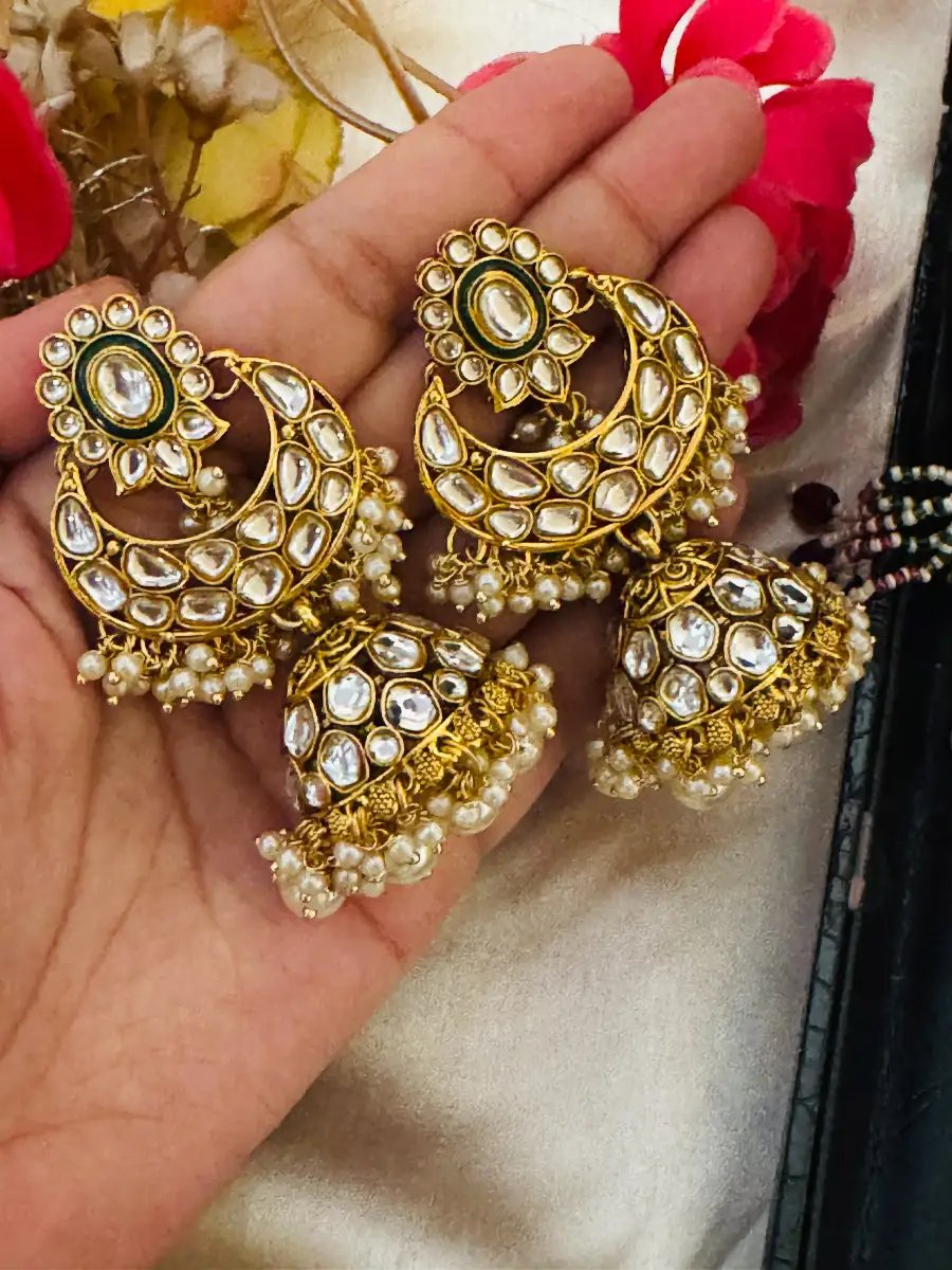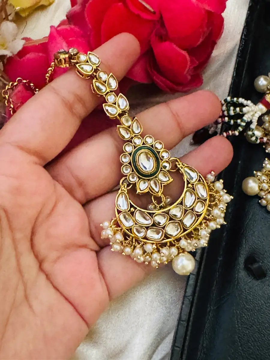 The set includes a bold collar necklace, matching jhumka earrings, a statement tikka, and an adjustable passa, making it the perfect choice for brides and wedding guests who want to embrace a truly regal look. Inspired by the heritage of Jaipur, this kundan collar set blends traditional Mughal artistry with modern sophistication, making it ideal for weddings, mehndi, barat, walima, and festive occasions.