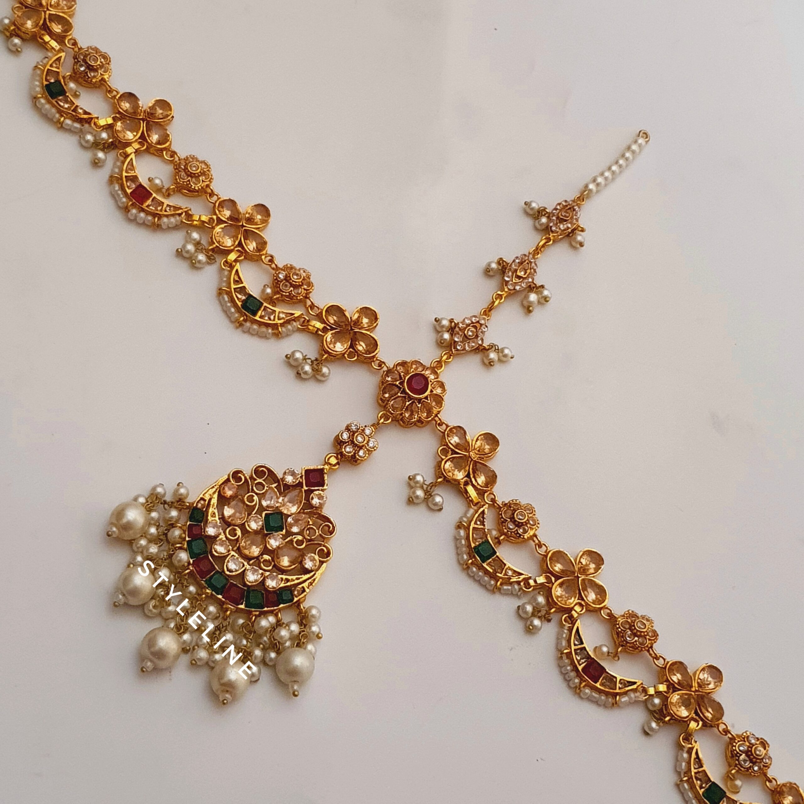 Trending headband/sheeshpati studded with zircons and embellished with pearls.