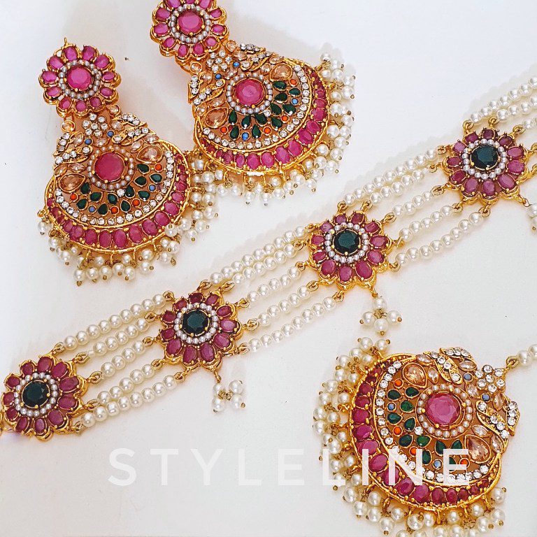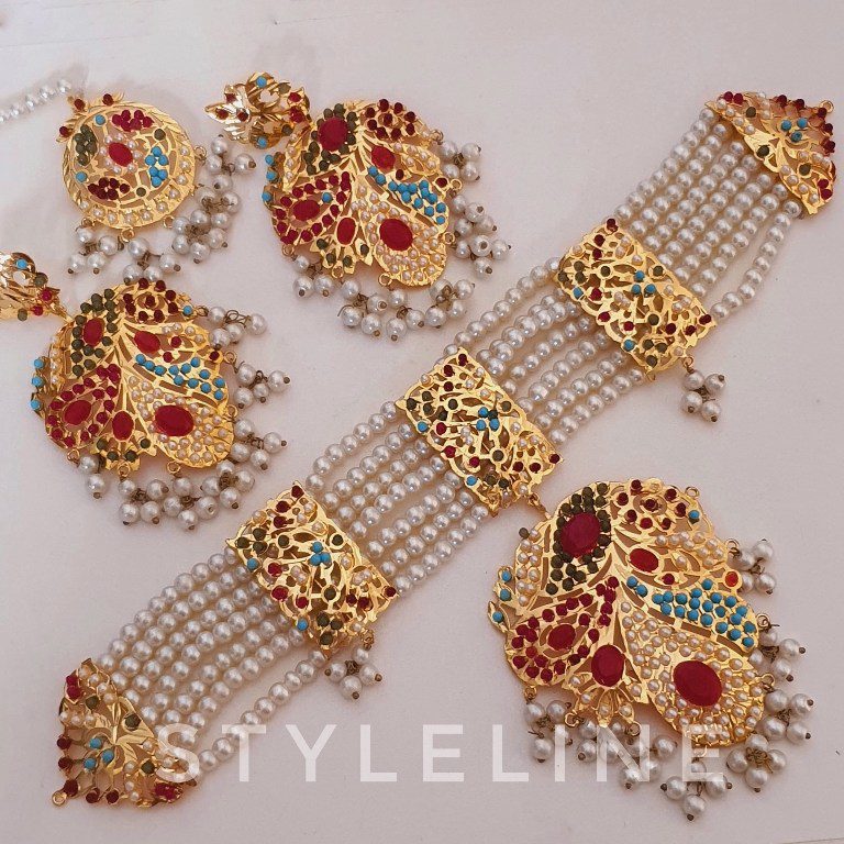 Finely quality hyderabadi naurattan choker, earrings and bindi set.