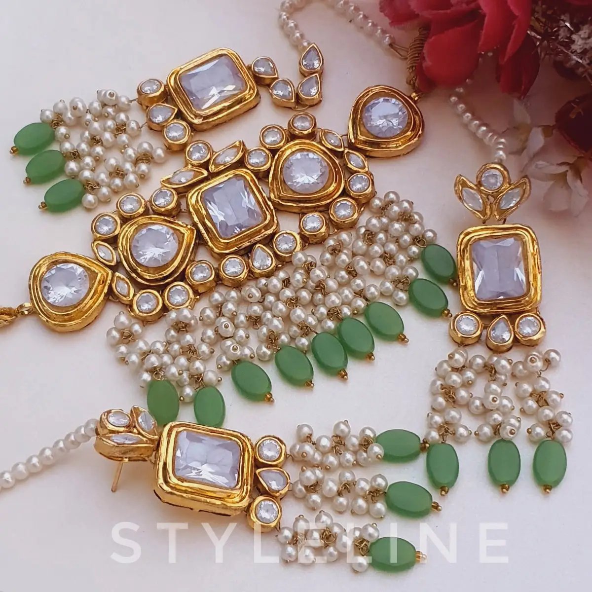 StyleLine brings you an exquisite 22K Gold Plated Polki Choker Set, designed for women who love timeless elegance with a touch of luxury. This handcrafted set showcases large zircon stones framed in rich gold plating, highlighted with pearl strings and green bead detailing for a regal finish.