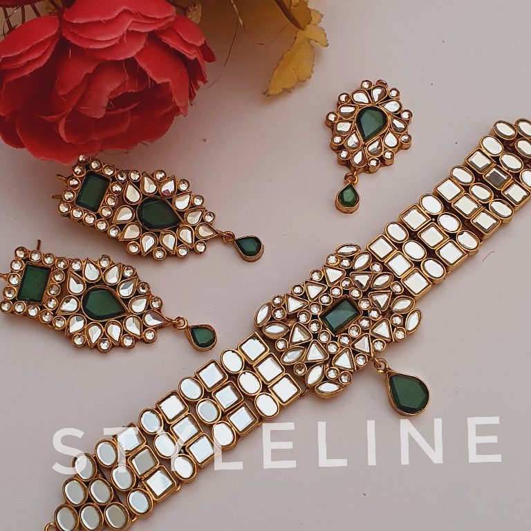 Finest quality handcrafted gold plated farshi kundun choker set in green.