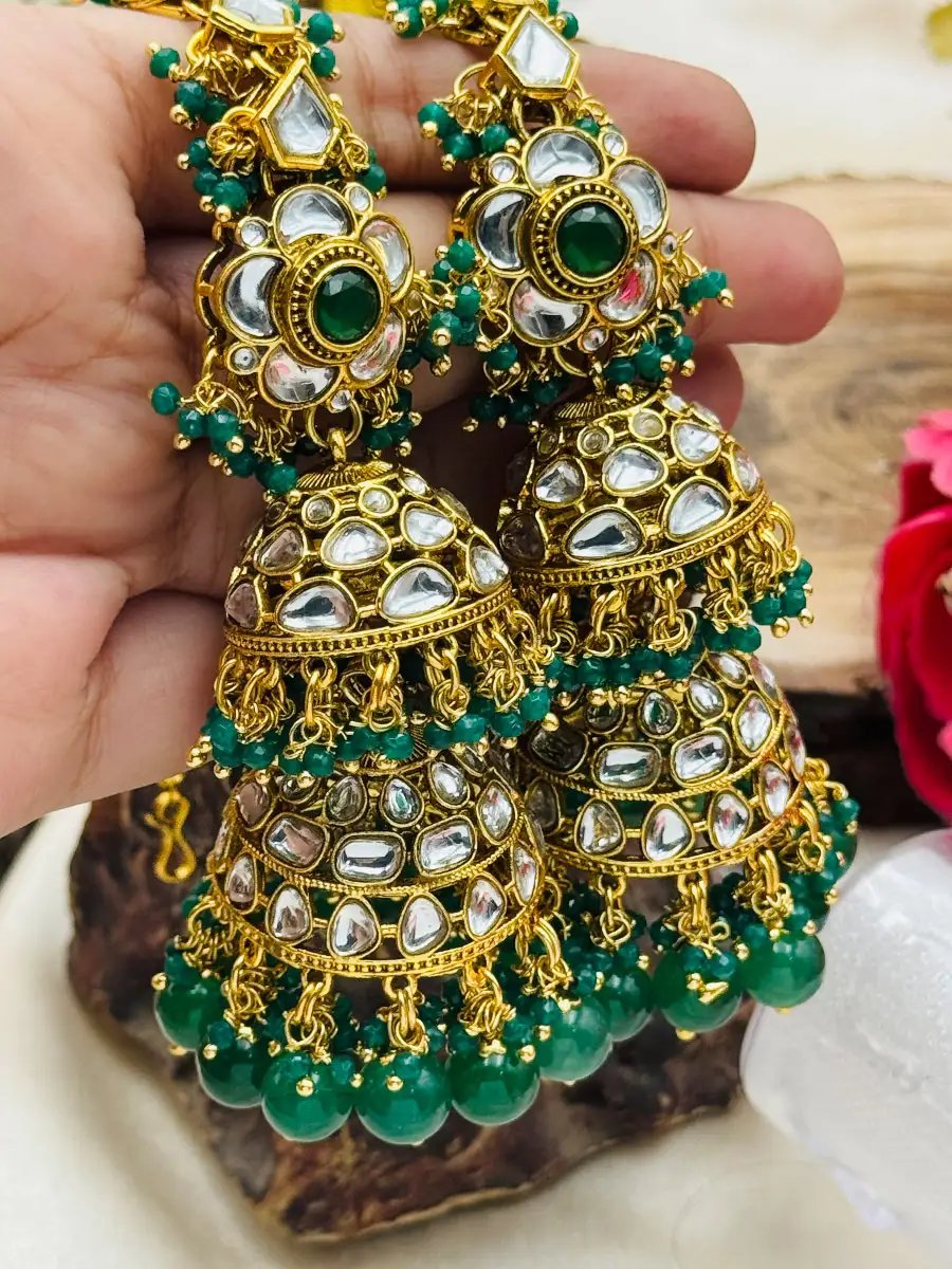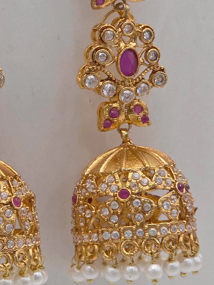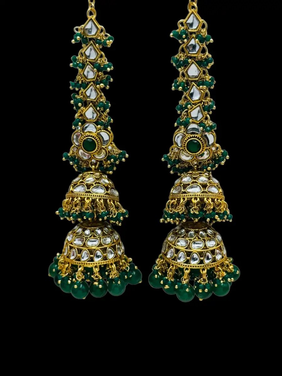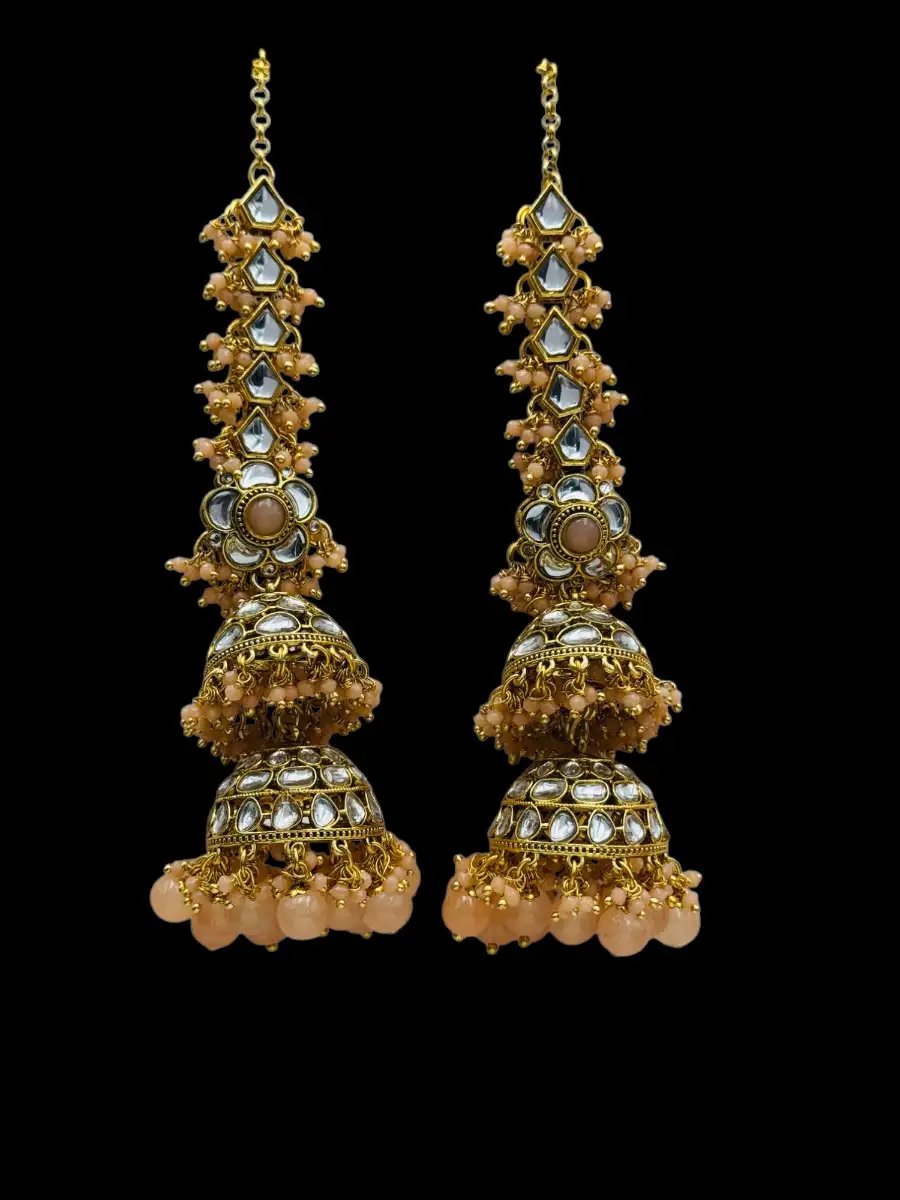 The long sahara strand gracefully flows from the ear to the jhumki, creating a regal silhouette that enhances lehengas, shararas, ghararas, and sarees. The dome-shaped jhumki is richly embellished with pearls and fine detailing, offering a luxurious finish while remaining comfortable to wear.
