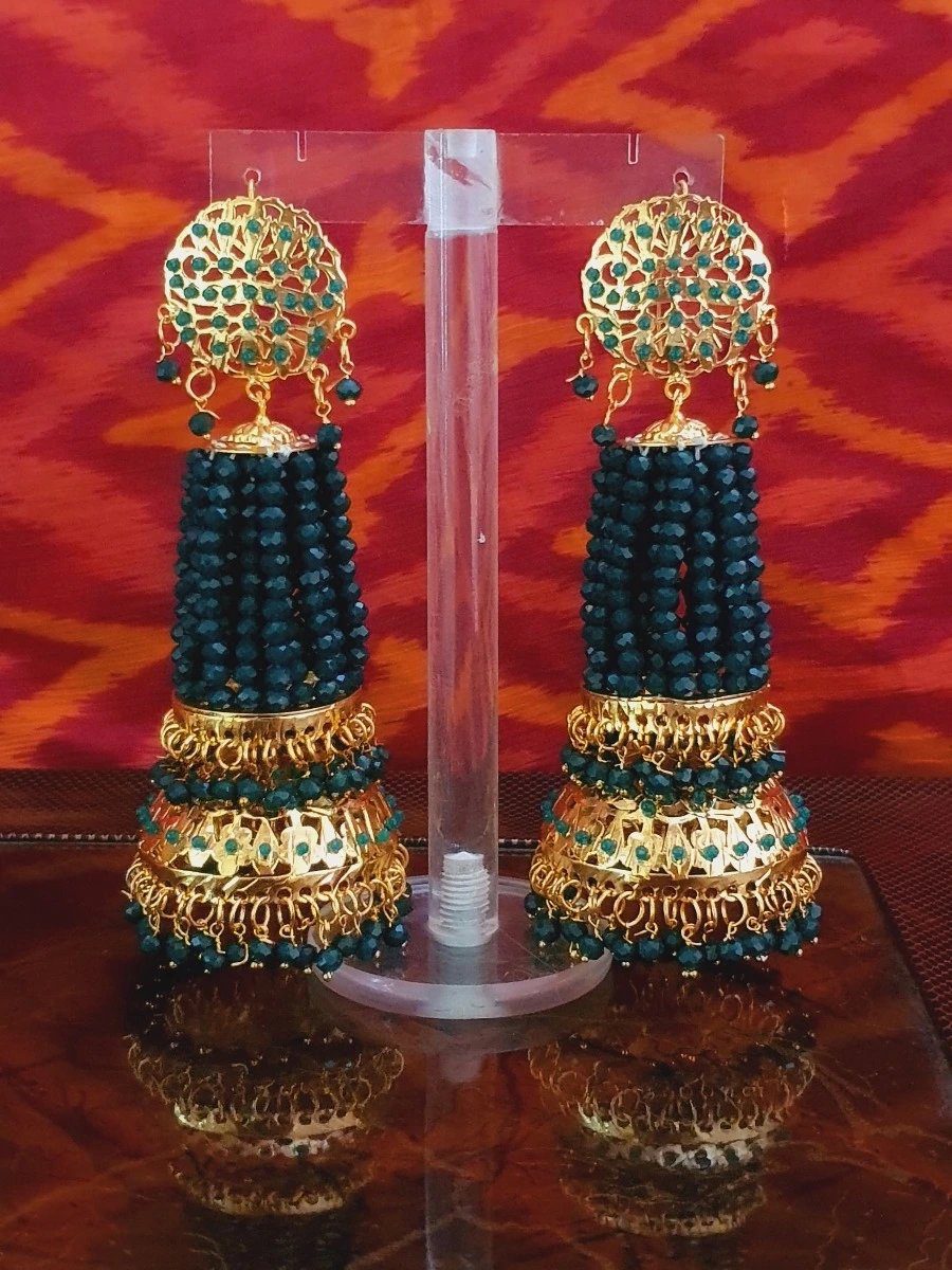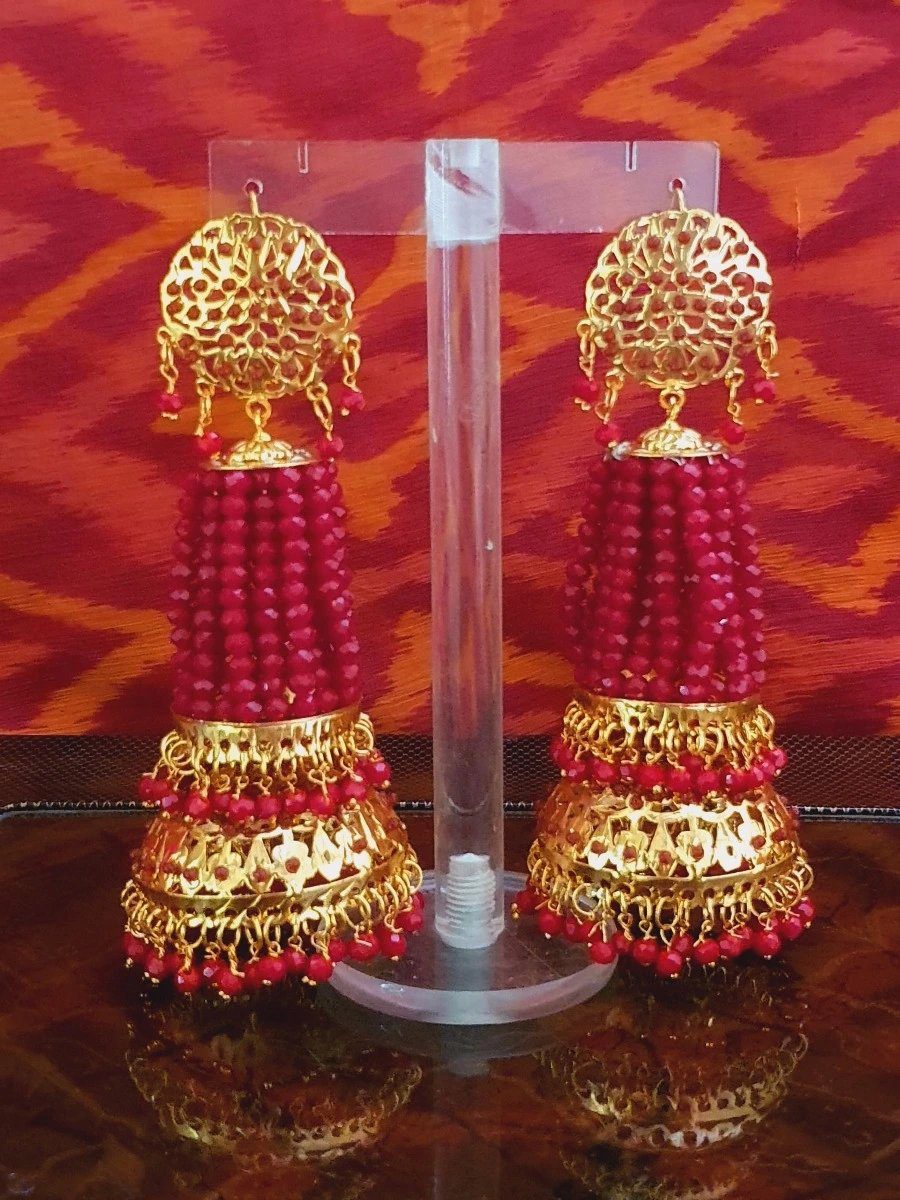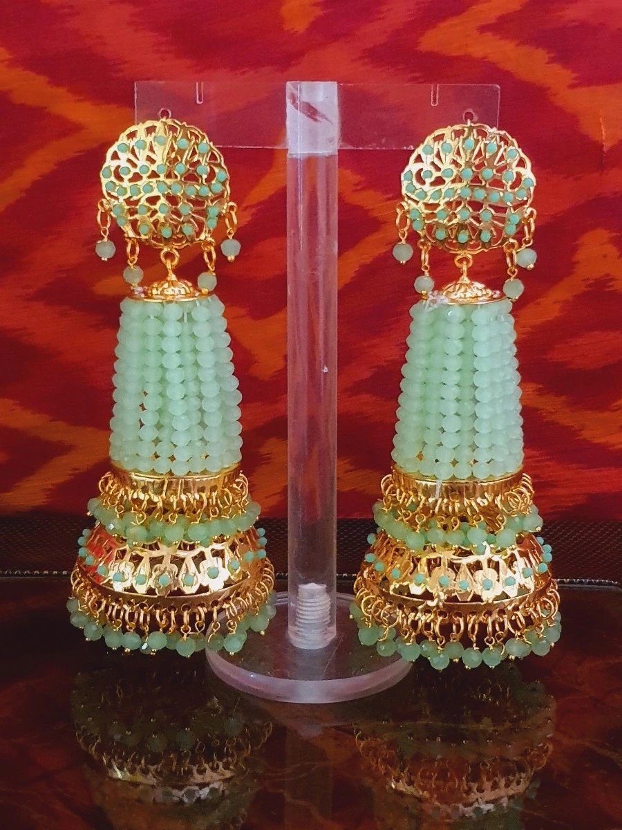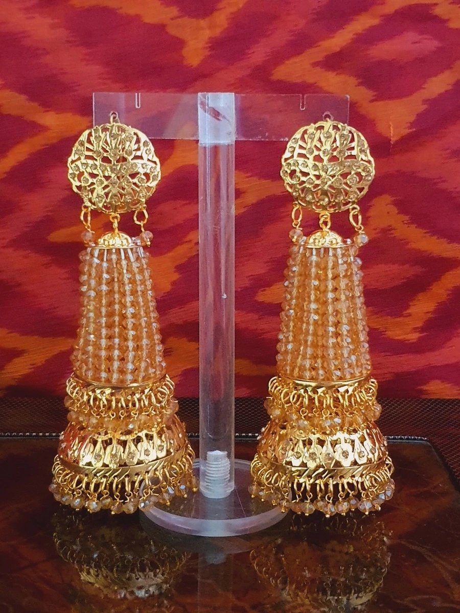 The long sahara strand gracefully flows from the ear to the jhumki, creating a regal silhouette that enhances lehengas, shararas, ghararas, and sarees. The dome-shaped jhumki is richly embellished with pearls and fine detailing, offering a luxurious finish while remaining comfortable to wear.
