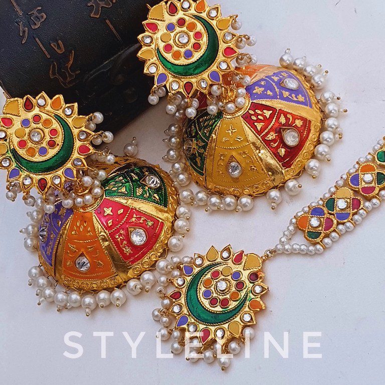 Finely handcrafted light weight oversize meenakari jhumki and bindi set.