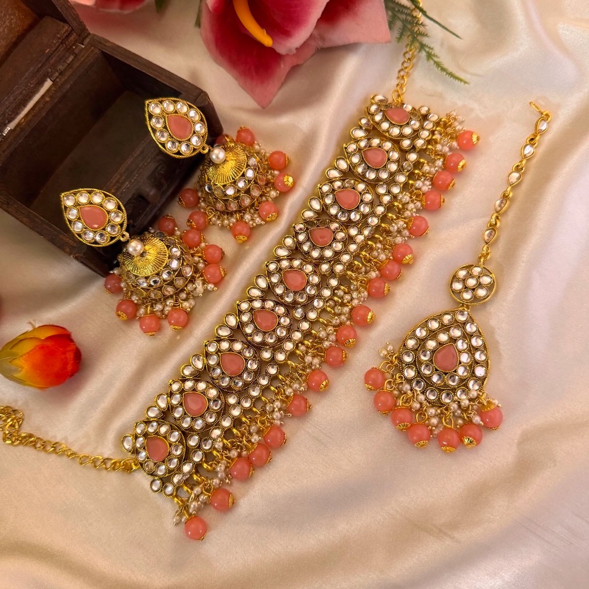 22k Gold Plated farshi kundun choker and earrings set in black color.