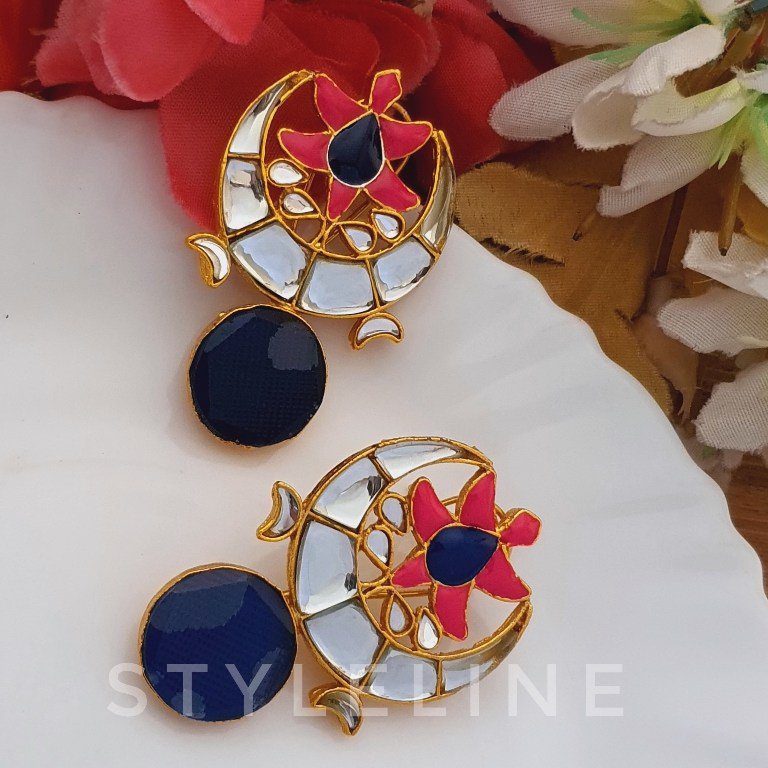 Elevate your ethnic look with our mirror work stud earrings. Featuring a stunning floral motif with a blue teardrop center, surrounded by shimmering champaign and blue mirror pieces, these studs are perfect for festive, bridal, and formal occasions. The intricate detailing is further enhanced with delicate beaded edging, giving them a regal touch. Lightweight yet statement-worthy, they offer both elegance and comfort. Ideal for pairing with lehengas, anarkalis, or fusion wear.