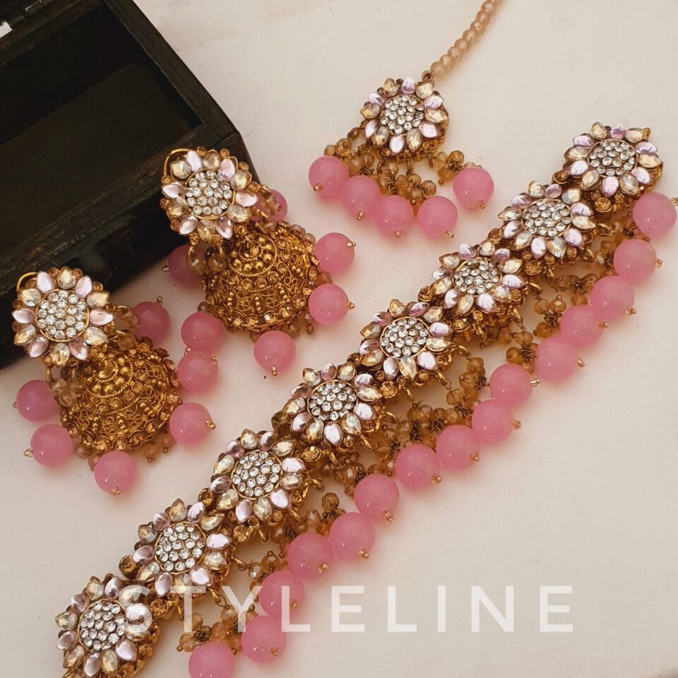 Handcrafted bahwalpuri choker, earrings and bindiĀ set in pink and golden combination .