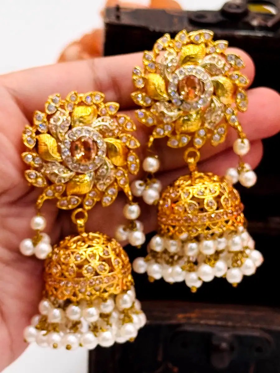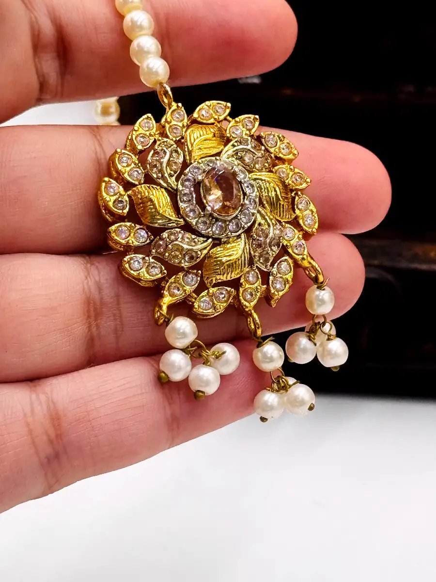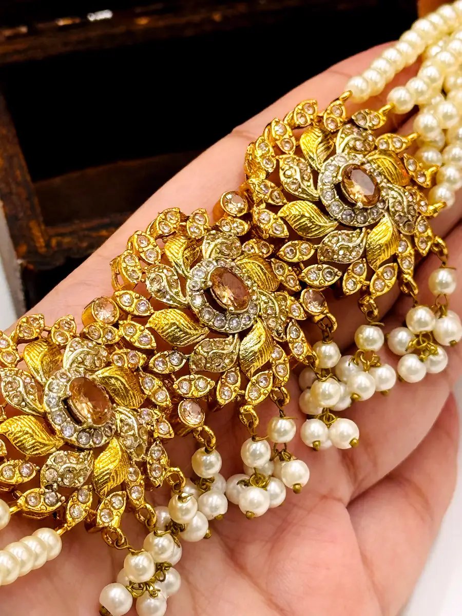 Elevate your festive look with this exquisite ZARLALA choker set, beautifully handcrafted with imtricate detailing, champaign stone accents, and multi-layered pearl strands. Paired with matching jhumka earrings and a stunning tikka, this set brings timeless grace and regal charm to every occasion.