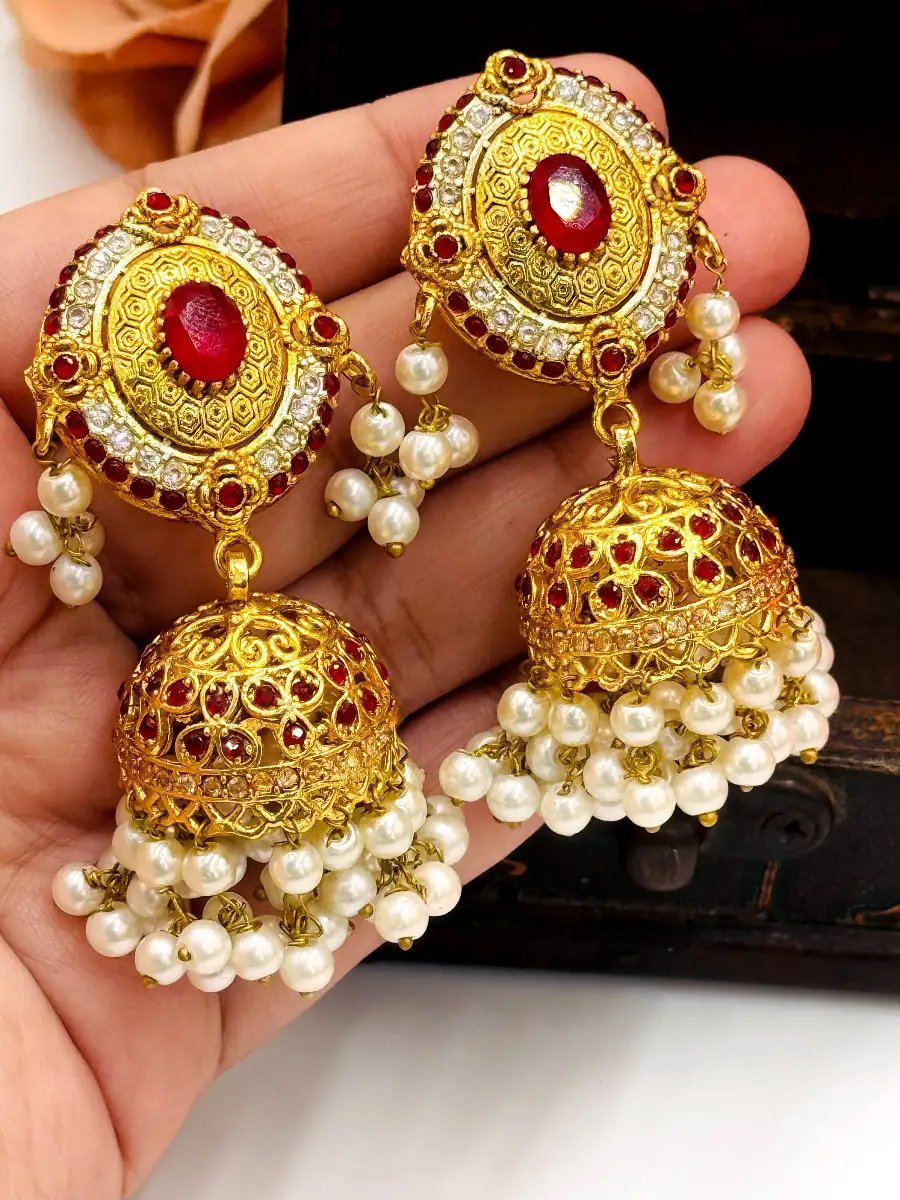 Elevate your festive look with StyleLine’s Premium Choker Set, a timeless fusion of traditional artistry and modern elegance. This exquisite jewelry set features a beautifully handcrafted gold-toned choker, adorned with lustrous deep maroon center gems, and delicate pearl hangings. Paired with matching statement Jhumka earrings and a coordinating Tikka, this set brings a regal charm to any festive, mehndi, mayun, baraat, or walima outfit.
